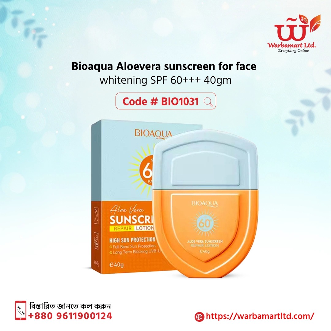 Bioaqua Aloevera sunscreen for face whitening SPF With broad-spectrum SPF 60+, this sunscreen shields your skin from UVA/UVB rays, preventing sunburn, redness, pigmentation, and early signs of aging.